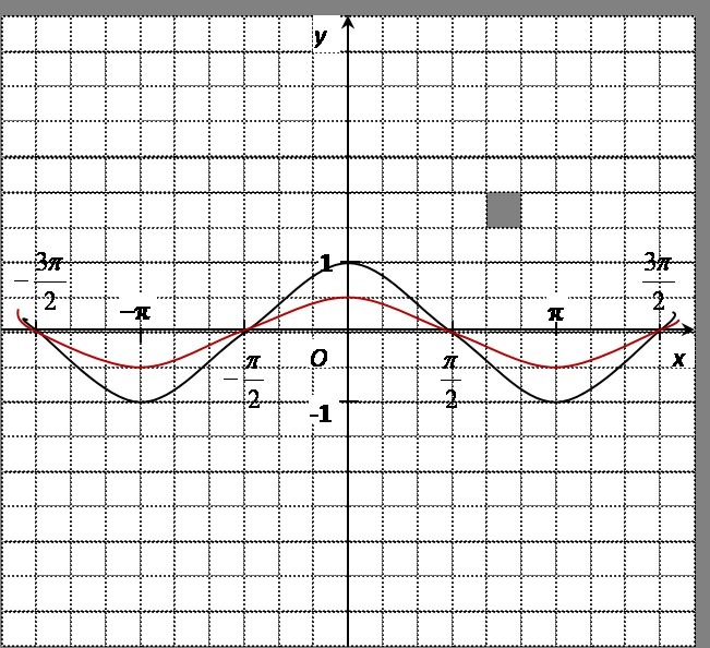 2) затем строим график функции у = 1/2 · cosx, учитывая, что он как бы "сжимается" к оси Ох в 2 раза (на рис. - красного цвета).