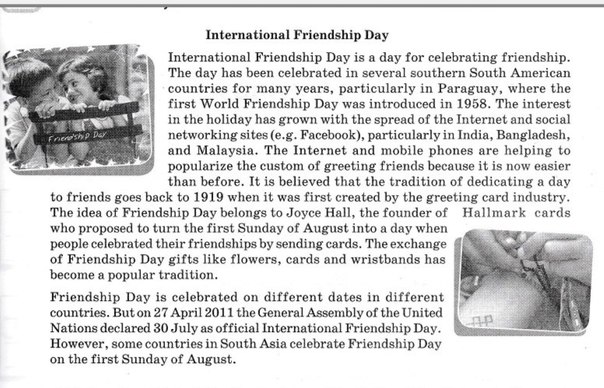Международный День Дружбы это день празднования дружбы. Этот день праздновался в некоторых южных странах Южной Америки, частично в Парагвае, где Международный день дружбы был впервые отмечен в 1958 году. Интерес к празднику вырос с широким распространением Интернета и социальных сетей (например Фэйсбук), частично в Индии, Бангладеше и Малайзии. Интернет и мобильные телефоны помогают делать популярнвм обычай поздравлять друзей, т.к это сделать проще чем раньше. Есть поверье, что традиция посвящать день друзьям была создана в 1919 году индустрией поздравительных открыток. Идея Дня Дружбы принадлежит Джойсу Холл, основателю компании Открытки Холлмарк, который предложил сделать первое воскресенье августа днем, когда люди празднуют дружбу посылая поздравительные открытки. Обмен подарками в День Дружбы, такими как цветы, открытки и браслеты, стал популярной традицией.