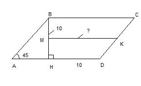 Умоляю, очень нужно.В параллелограмме АВСД градусная мера угла А равна 45 градусов . ВН -перпендикуляр, проведенный к стороне АД. Найдите длину средней
