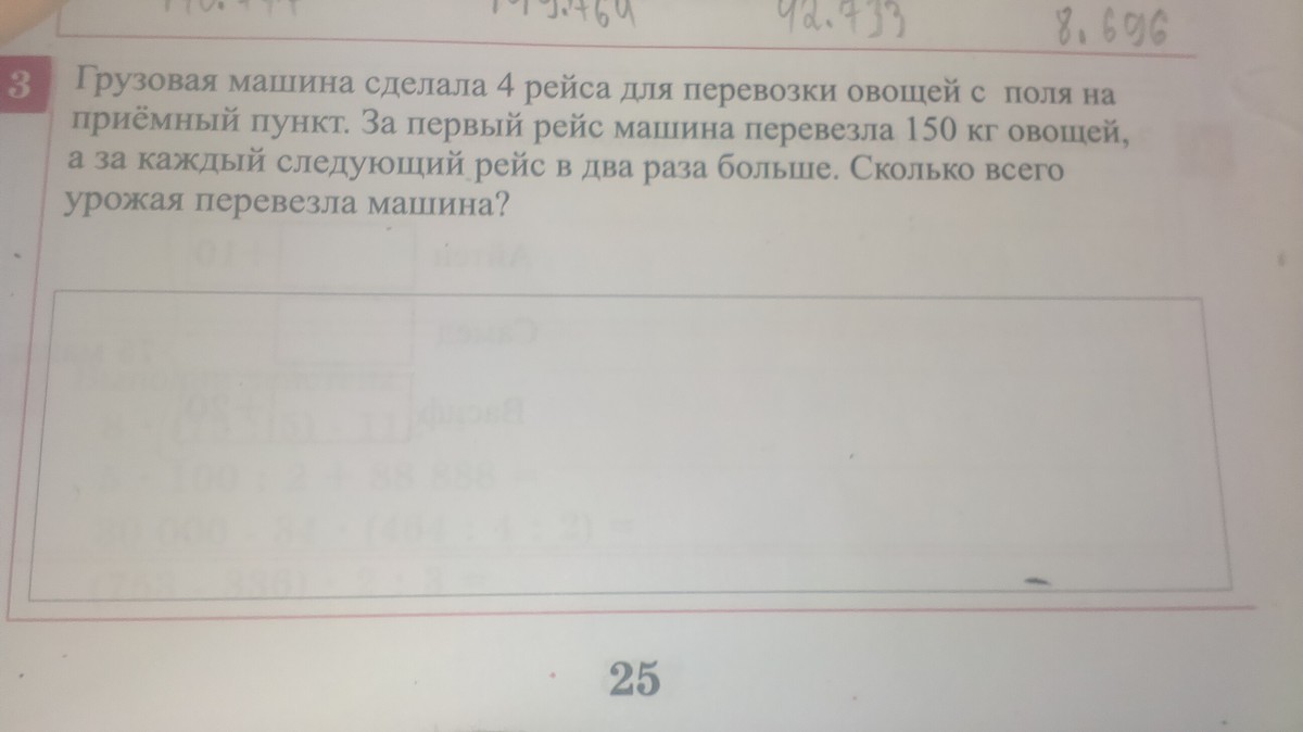150*2=300 кг овощей за 2 рейса, 300*2=600кг овощей за 3 рейса ,600*2=1200кг овощей за 4 рейса,150+300=450 кг овощей за 1 и 2 рейс,450+600=1050кг овощей за 1 и 2 и 3 рейс,1050+1200=2250кг всего
