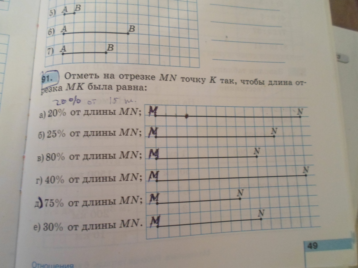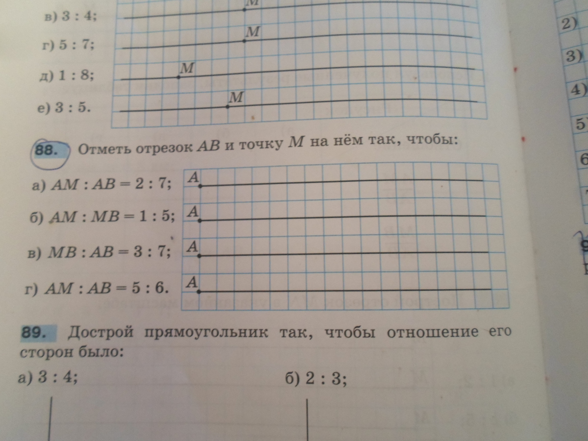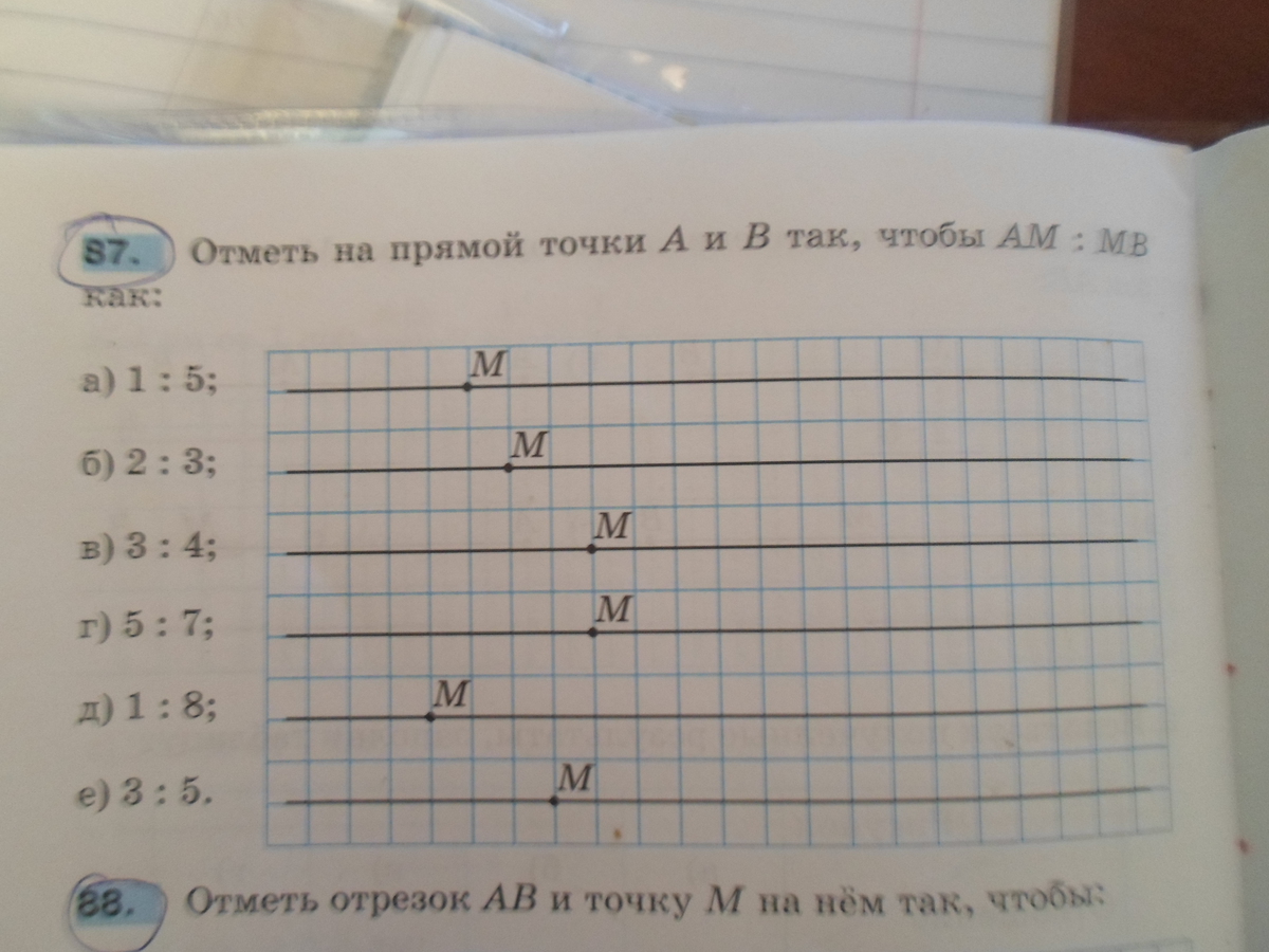 В 87. Очень легко.У тебя точка М в первом например 1:5,значит от точки М отсчитываешь одну клетку назад и ставишь букву А ,а потом отсчитываешь 5 клеточек в перед и ставишь букву В
