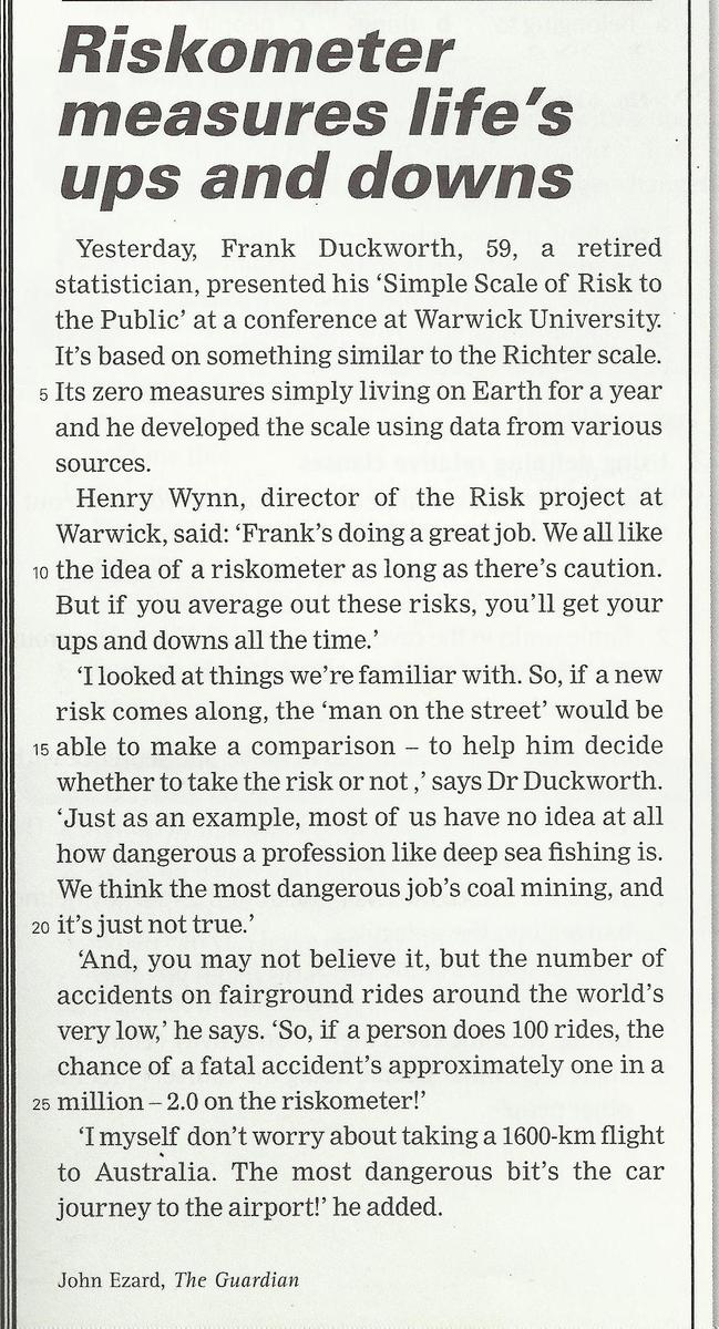 Вчера 59-летний Франк Дакворс, статистик на пенсии, опубликовал свою "Простую шкалу риска для общественности" на конференции в Варвикском Университете. Она основана на чем-то схожем со шкалой Рихтера. Её 0 обозначает простую жизнь на Земле в течение 1 года, и он разработал шкалу, используя информацию из разнообразных источников.