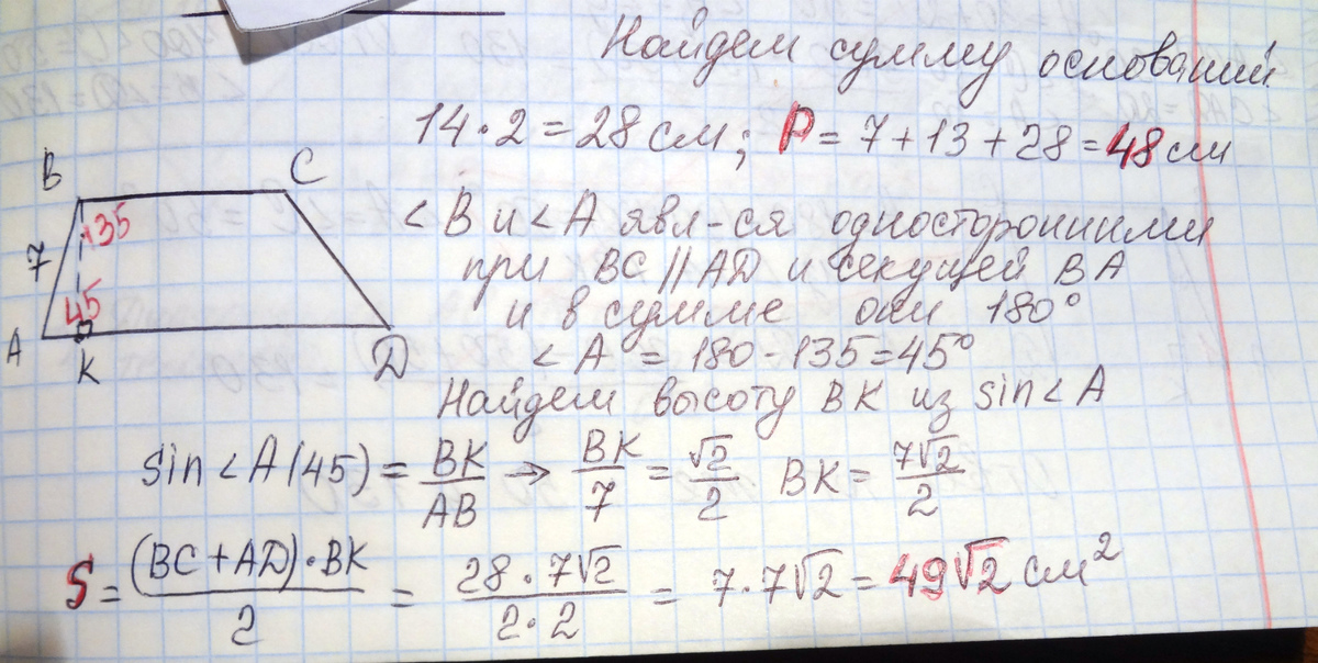 Боковые сторона трапеции (ABCD) равны 7 (AB) и 13 (CD) см , а средняя линия равна 14 .Найдите периметр и площадь трапеции, если угол Б = 135.