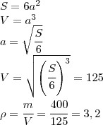 Определите плотность материала, из которого изготовлен куб массой 800г.Площадь поверхнсти куба 150см квадратных