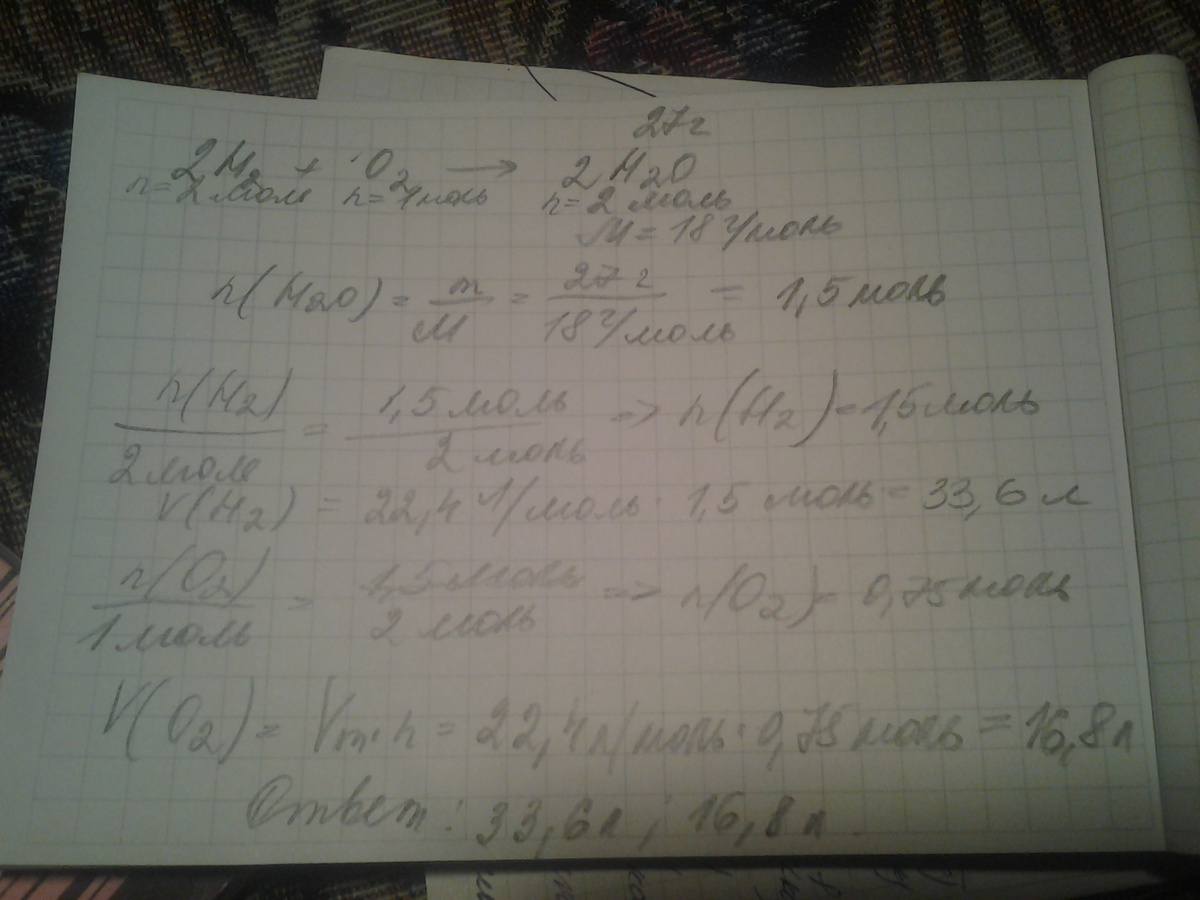 в результате реакции между водородом и кислородом образовалась вода массой 27 г. Найти объемы вступивших в реакцию газов