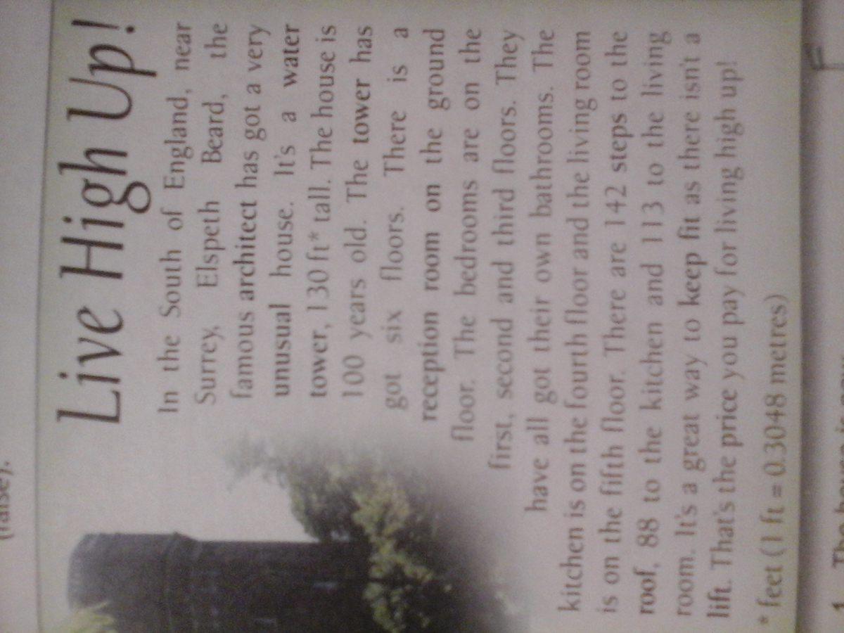 перевод беглый: на юге Англии около сюрэя известный архитектор имеет необычный дом. это водонапорная башня. башне сто лет. она имеет шесть этажей. ресепшн на первом этаже. спальни на втором, третьем и четвертом, они все имеют свои ванные. кухня на пятом этаже и жилая комната на шестом. там 142 ступеньки на лестнице. 88 до кухни и 113 до жилой комнаты. это великий способ поддерживать форму не пользуясь лифтом. цена которую ты платишь за проживание там растет