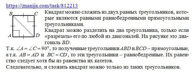 Квадрат можно сложить из двух равных треугольников, которые являются равнобедренными!!! Например, квадрат со стороной 2см. Нужны трег. с боковыми сторонами по 2 см.