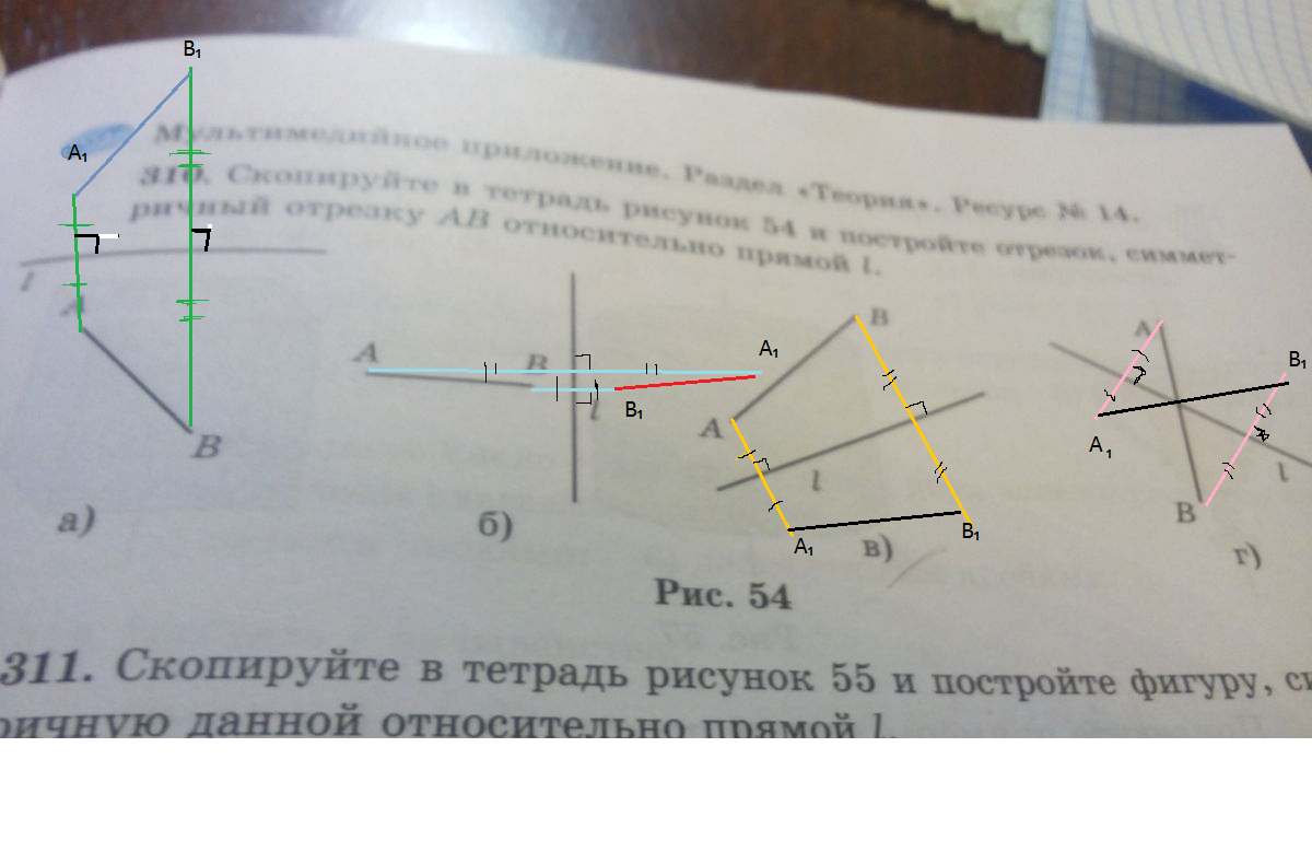 скопируйте в тетрадь рисунок 54 и постройте отрезок, симмктричный отрезку AB относительно прямой L