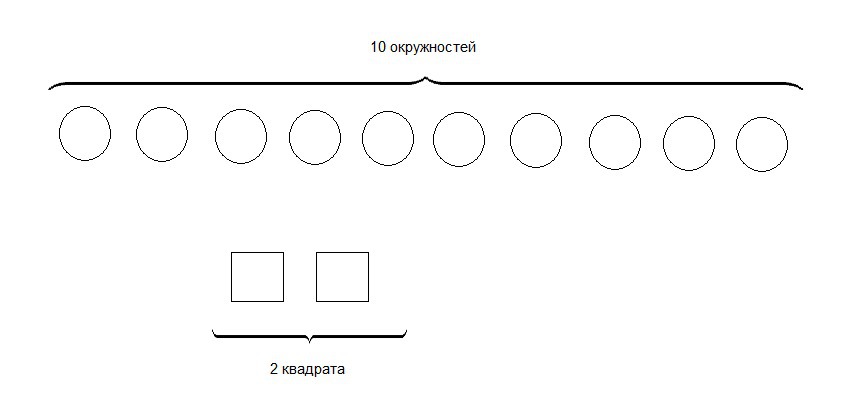 нарисуй 10 кружков и 2 квадрата. во сколько раз кружков больше, чем квадратов? во сколько раз квадратов меньше , чем кружков?