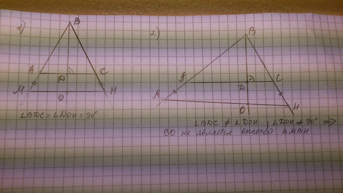 Дан треугольник АВС с основанием АС и высотой ВД. На лучах ВА и ВС вне треугольгика АВС отложены равные отрезки АМ и СН. Луч ВД пересекает отрезок МН в точке О. Док-ть, что ВО-высота треугольника МВН
