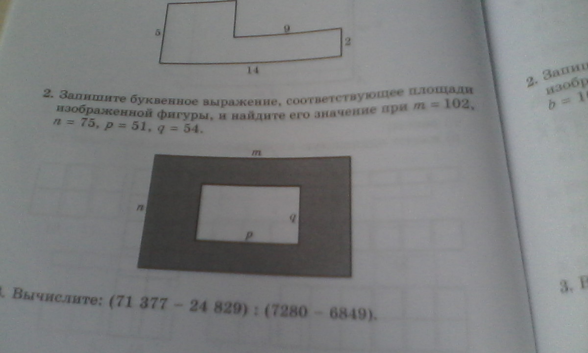 Запишите буквенное выражение , соответствующее площади изображенной фигуры , и найдите его значение при m=102,n=75,p=51‚q=54
