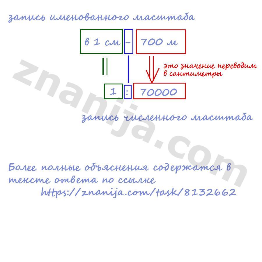 1) в 1 см - 700 м. Мы знаем, что в 1 м - 100 см, соответственно 700 м = 70 000 см (для простоты иногда рекомендуют просто запомнить, что при переводе из метров сантиметры можно просто добавить два нуля). Численный масштаб: 1:70000.