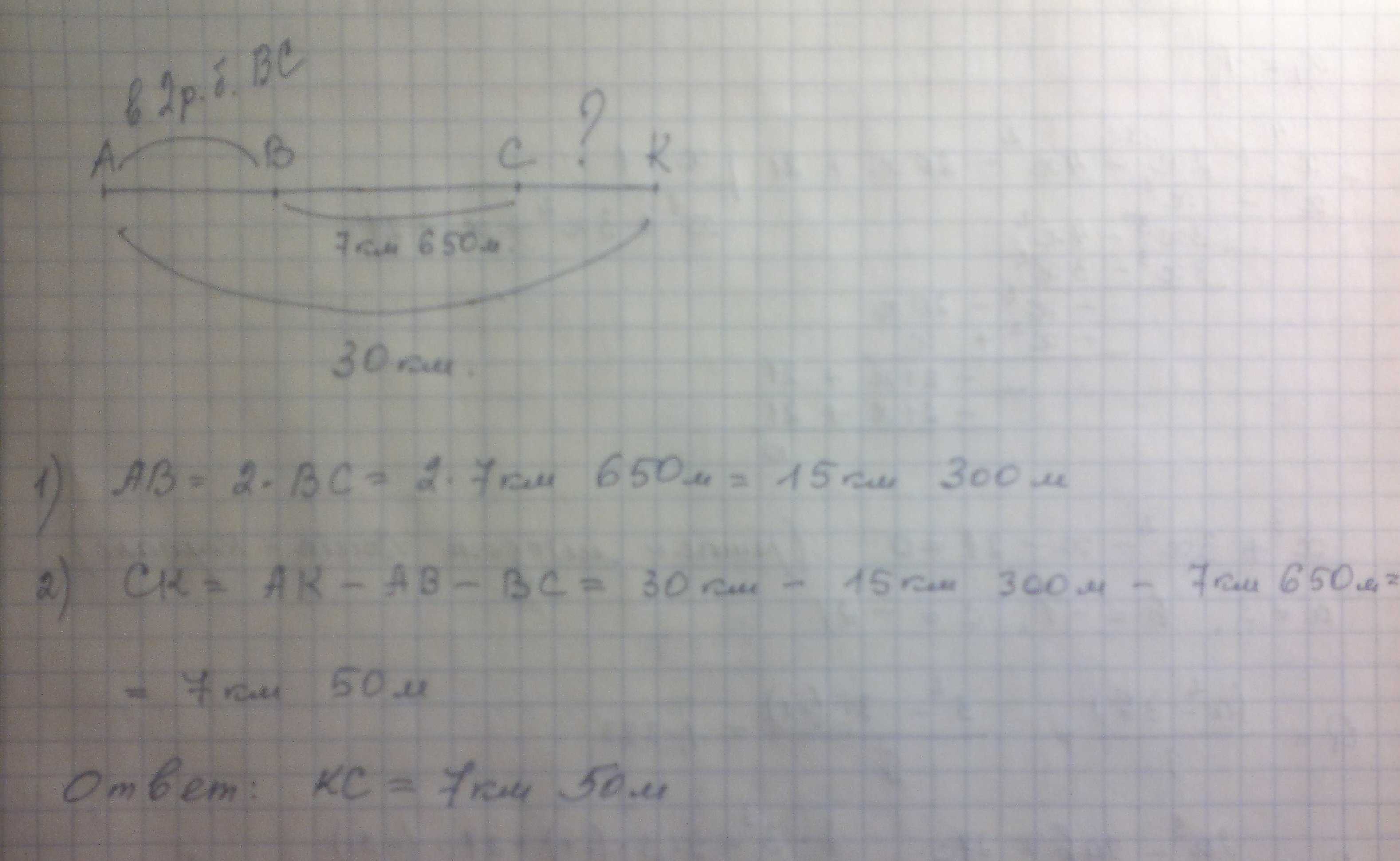 От пристани А до пристани К-30км.Расстояние между пристани В и С-7км 650м,а между А и В вдвое больше.Чему равно расстояние между пристани К и С?