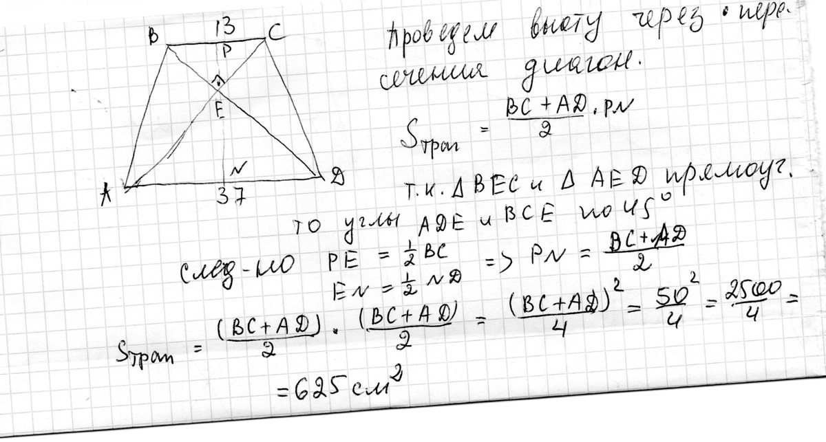 S=((a+b)/2)*h=((37+13)*25)/2=25*25=625