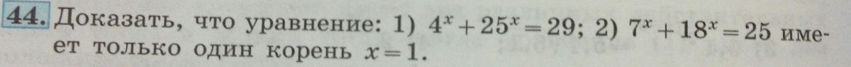 Так как функции y = 4^x + 25^x и y = 7^x + 18^x - возрастающие, то каждое своё значение они принимают только один раз. Следовательно, у уравнений не может быть больше одного корня.