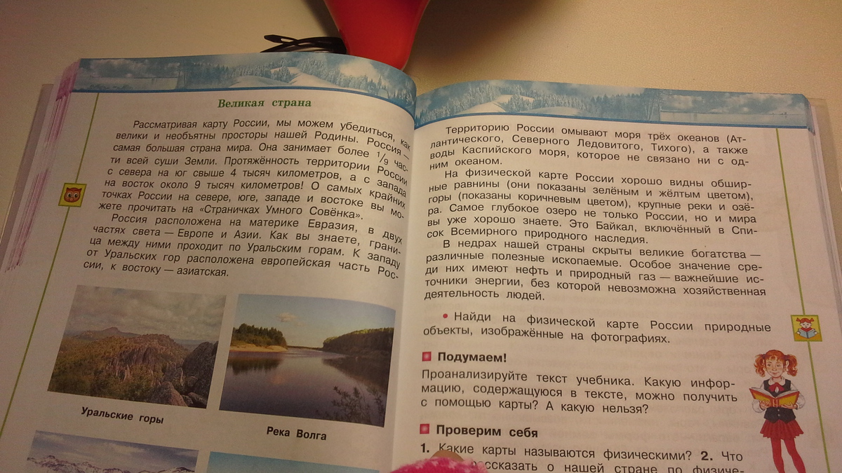 Наша страна - Россия-необъятная.Она самая большая в мире.Расположена на материке Евразия,омывают ее три океана-Атлантический,Северный Ледовитый и Тихий,а граница Европы и Азии проходит по Уральским горам.У нашей страны разнообразный рельеф ,и очень много глубоководных рек и озер. Самое глубокое озеро в мире тоже у нас,это Байкал, которое включено в список Всемирного Наследия. Наша страна богата на минералы,особенно на нефть и природный газ-важнейшие источники энергии в наше время.