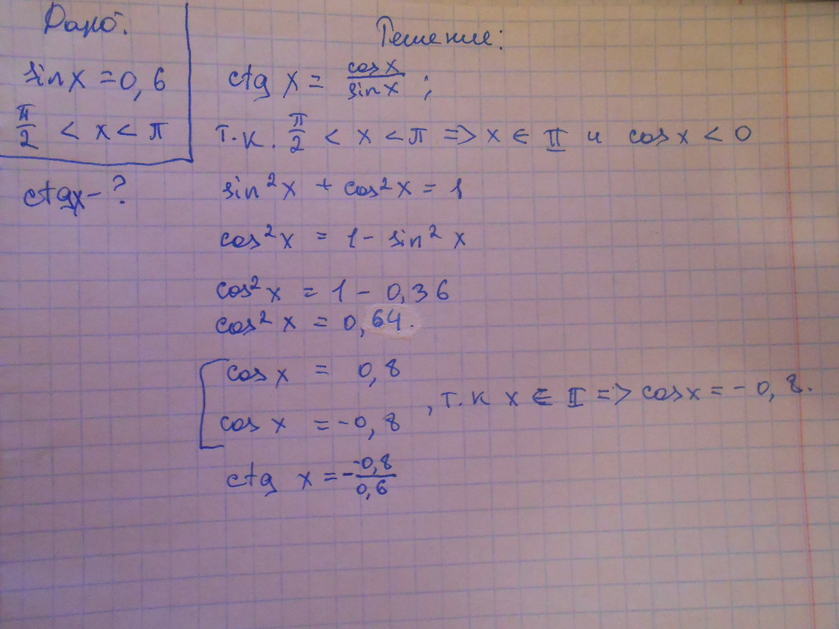 Найдите ctgx.ecли sinx=0.6 где пи делёное на 2 <x < ПИ
