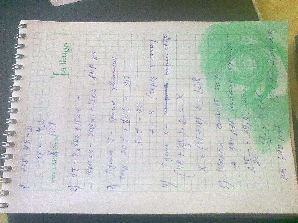 !.)438-4*х=2 2.)вычисли и вырази результат в килограммах:1т-2ц8кг+15кг Из двух городов,расстояние между которыми 90 км,одновременно навстречу друг другу выехали велосипедисты.Первый ехал со скоростью 20кмч ,а второй - 10кмч.Через сколько часов они встретятся ? 3.)длина прямоугольника 48 см,а ширина в 3 раза меньше.Найди периметр прямоугольника 4.)В супермаркете проходит реклама акция:покупая 4 шоколадки, 5-ую шоколадку покупатель получает бесплатно в подарок.Шоколадка стоит 20 рублей. Какое наибольшее число шоколадок можно получить за 390 рублей?Да решите мне плз!!!!!