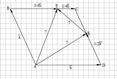 Дано:ABCD-ромб,E принадлежит BC,BE:EC=3:1,K-середина DC,AB=a,AD=b.Выразите векторы AE,AK,KE через векторы a и b.Помогите очень срочно!!!!Пожалуйста,прошу)