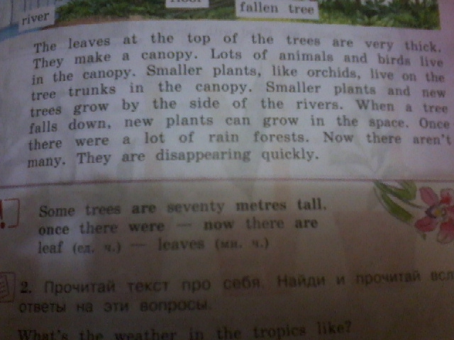 Листья в верхней части деревьев очень толстые.Они делают навес,а в этом навесе норки.Много зверей и птиц живут в этих норках..Небольшие растения, как орхидеи живут на трех стволов в норках.Маленькие растения и новые деревья растут на берегу реки.Когда что-то падает или умирает, то новые растения могут расти в пространстве.Когда-то здесь было много дождевых лесов.Теперь их там очень мало.Они быстро исчезают.