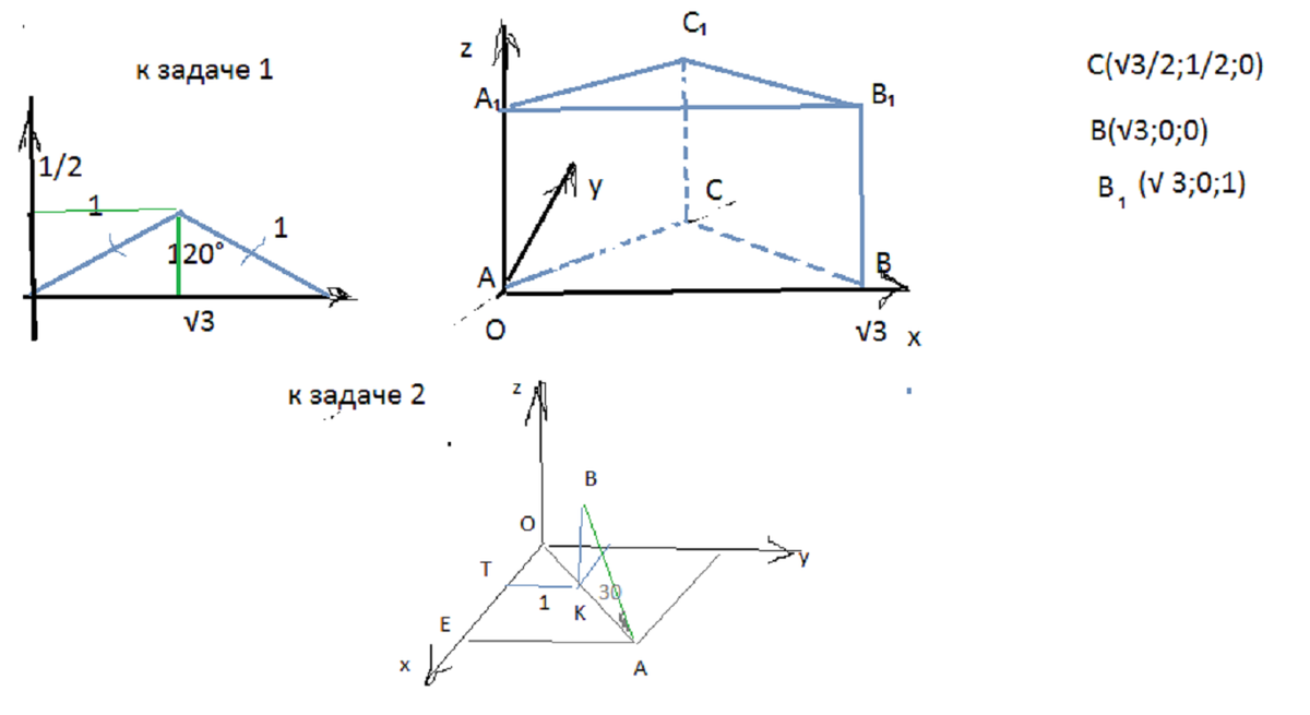 Расположим призму так, чтобы сторона АВ совпадала с осью ох, А с началом координат.Тогда координаты точек легко найти.