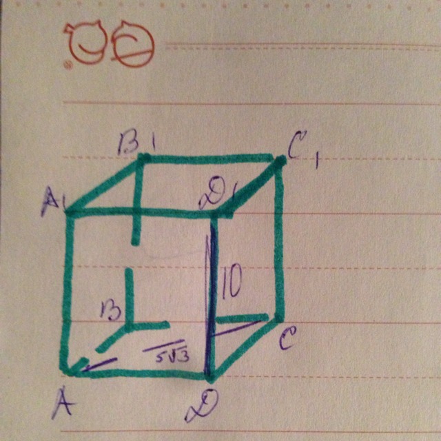Найти объем правильной четырехугольной призмы, диагональ основания которой =5√3, а боковое ребро=10. Я уже все перепробовала, битый час над ней сижу.