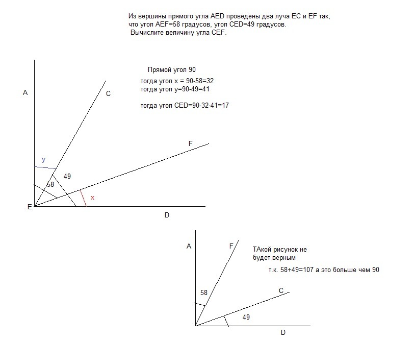 Математика, 5 класс. Дидактические материалы. А.Г. Мерзляк, В.Б. Полонский и тд. Задание №81. Из вершины прямого угла AED проведены два луча EC и EF так, что угол AEF=58 градусов, угол CED=49 градусов. Вычислите величину угла CEF. Помогите, пожалуйста, разобраться, не получается решения. Спасибо))
