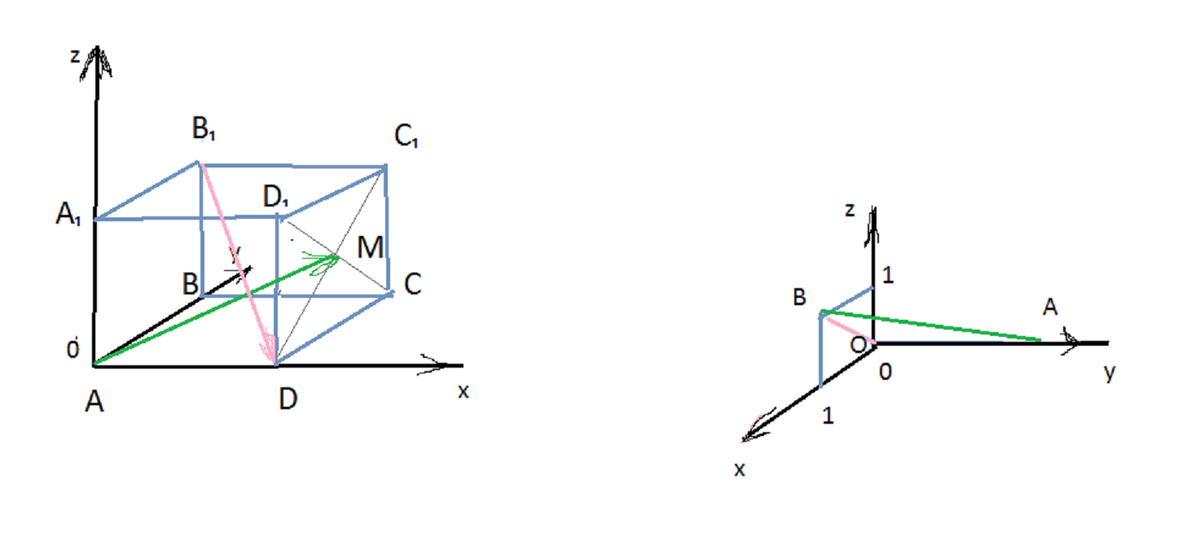 1. В кубе ABCDA1B1C1D1 длина ребра равна 1. M - центр грани DD1C1C. Используя метод координат, найдите:
