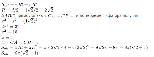 1.Осевое сечение конуса – прямоугольный треугольник с гипотенузой 4 ( кв.кор.из2) см. Найдите площадь полной поверхности.