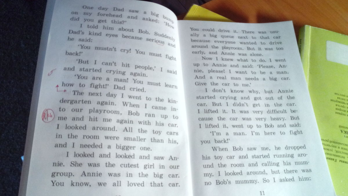 Я смотрел и смотрел, тут увидел Анни. Она была самой милой девочкой в нашей группе. Анни была в большой машине. Вы знаете, мы все любим эту машину. На этой машине можно кататься. Обычно здесь бывает большая очередь, но было рано и никого не было. Я попросил Анни машинку. Она заплакала и вылезла из машины. Я поднял тяжёлую машину. Затем я забежал в игровую комнату и замахнулся на Боба. Он ринулся с места, и бежал пока не упал и не заплакал. Он хотел позвать маму, но мамы рядом не было. С тех пор он никого не бил. Я отдал машинку Анни. Она улыбнулась, и я почувствовал себя настоящим героем.