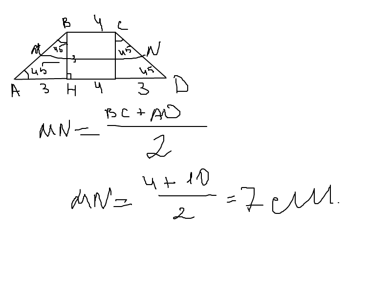 В равнобедренной трапеции ABCD угол A= углу D=45 градусов, BC=4 см, а высота трапеции равна 3 см. Найдите среднюю линию трапеции