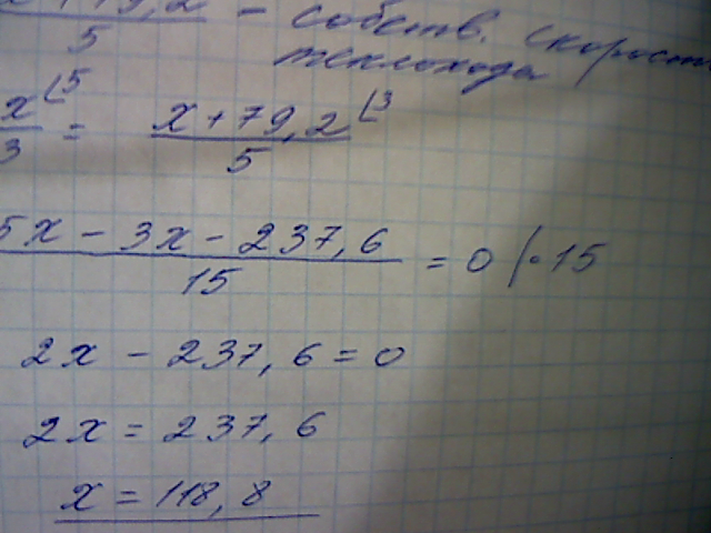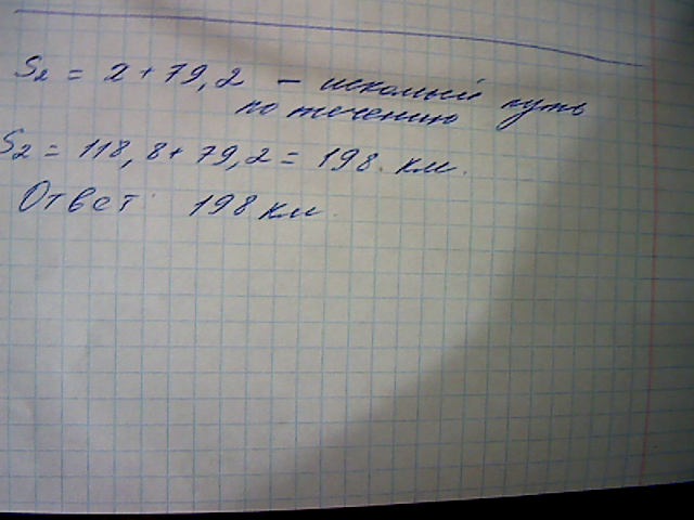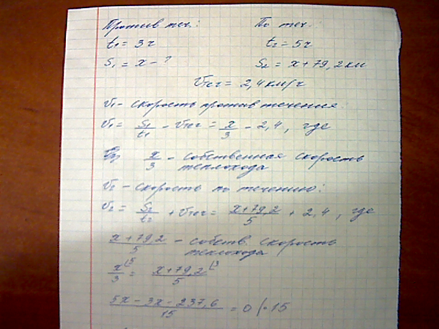 теплоход шел 3 час против течения и 5 по течению .путь пройденый по течению на 79.2 км больше чем против течения.найти путь по течению если течение скорость 2.4 км ч