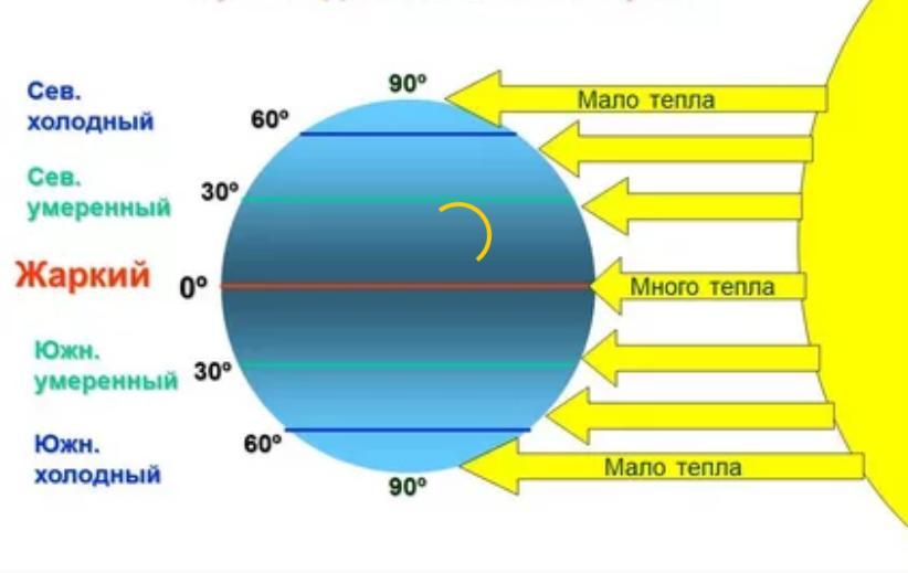 Всего на земле существуют один жаркий пояс,два умеренных (северный и южный) и два холодных (северный и южный).Больше всего тепла получает жаркий пояс,а меньше всего холодные.Это связано с нагреванием Земли,которое зависит от угла падения солнечных лучей.