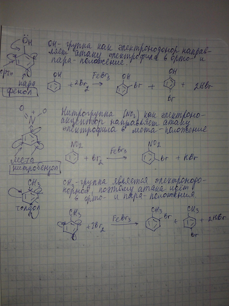Используя правила ориентации в бензольном ядре, напишите, какие монобромпроизводные образуются при бромировании фенола, нитробензола, толуола в присутствии катализаторов.