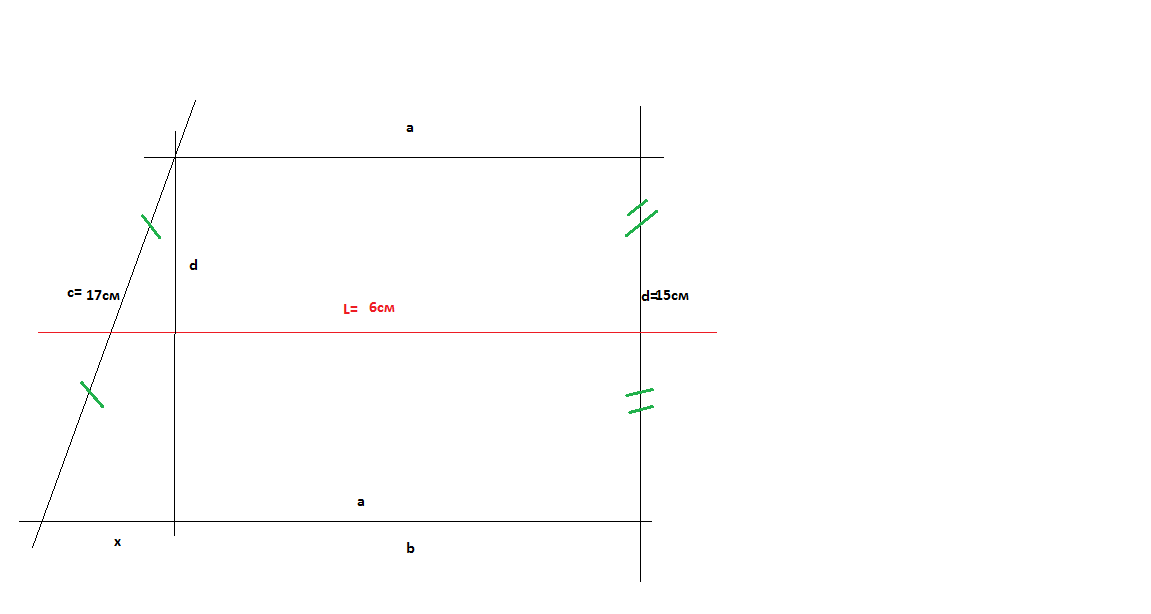 в прямоугольной трапеции боковая сторона равна 15 см и 17 см ,средняя линия - 6 см.Найдите основание трапеции.