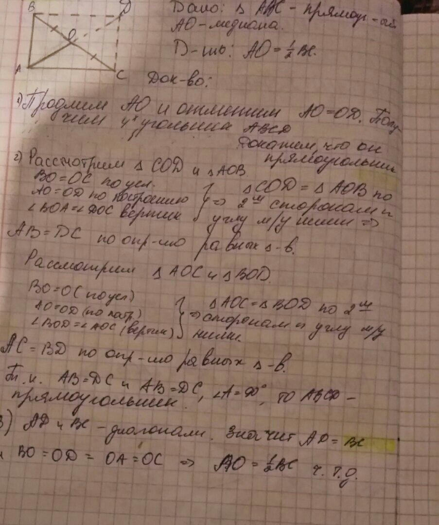 Докажите , что медиана прямоугольного треугольника , проведенная к гипотенузе, равна половине гипотенузы