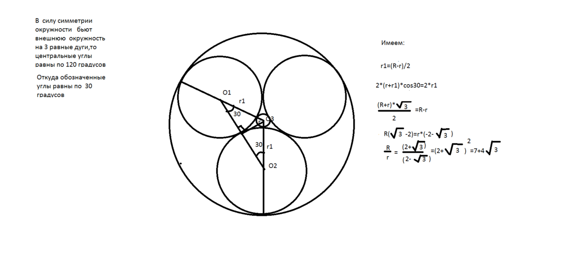 Три данные окружности одинакового радиуса попарно касаются друг друга. Найдите отношение радиусов двух окружностей, каждая из которых касается трех