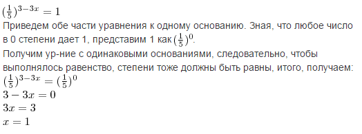 Приведем обе части уравнения к одному основанию. Зная, что любое число в 0 степени дает 1, представим 1 как