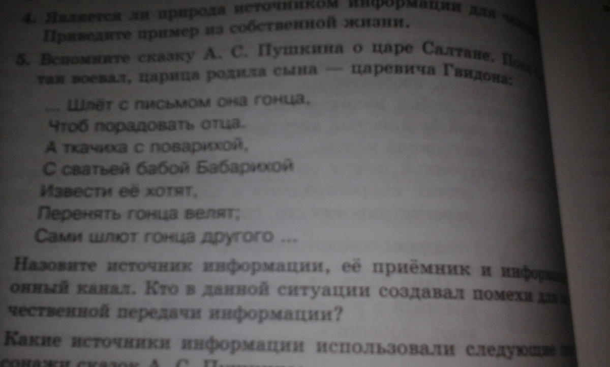 источник - царица, приёмник - царь, информационный канал - гонец, а помехи - повариха, ткачиха и сватья баба