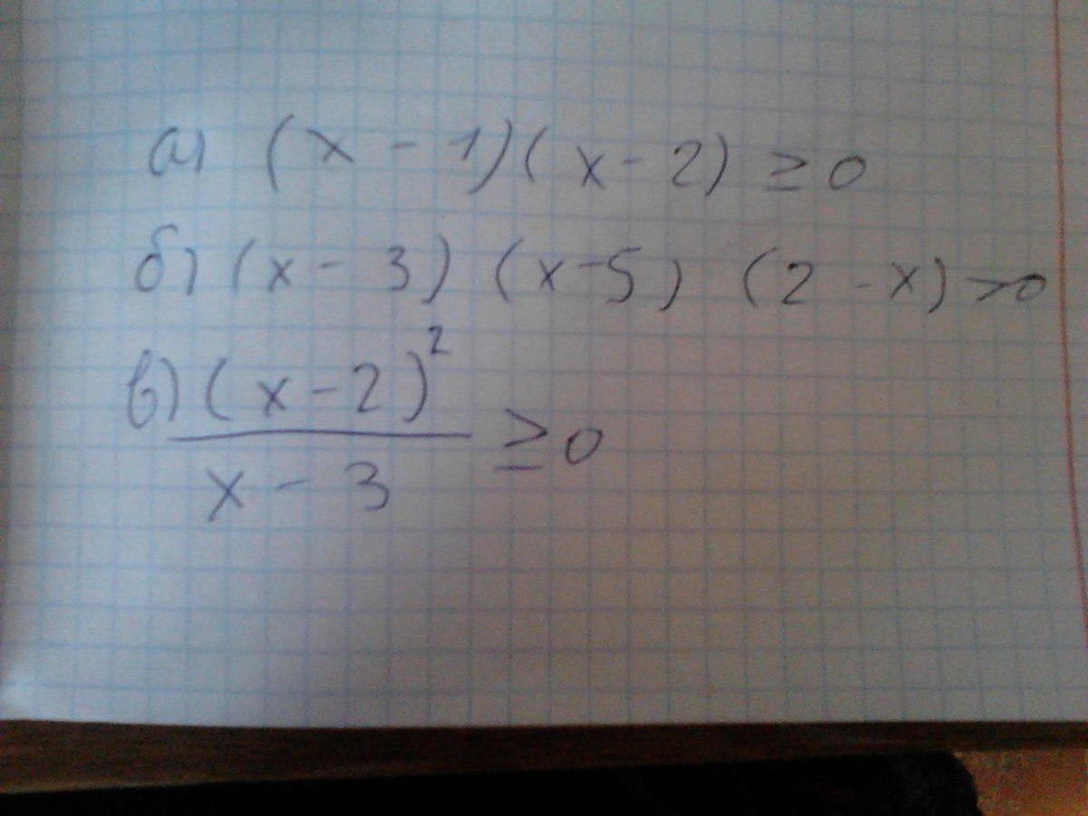 3)(x-2)^2/(x-3)>=0 (x-2)^2>=0 всегда значит х-3=0 х=3 на оси х одна выколотая точка х=3 смотрим слева и справа от х=3 берем х =2 и х=4