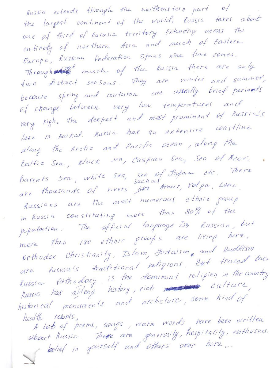 Россия самая большая страна в мире . Именно о ней сложено много стихов, песен, сказано много добрых и теплых слов. Здесь есть великодушие , гостеприимство , задор , вера в себя и окружающих!