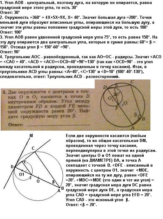 5. Если две окружности касаются (любым образом), то их общая касательная DM, проведенная через точку касания, перпендикулярна в этой точке их радиусам. Значит центры О и О1 лежат на одной прямой (на ДИАМЕТРЕ) DA, и точка А совпадает с точкой В. <DFE - вписанный в окружность с центром О1, значит <MDE, опирающийся на ту же дугу, равен <DFE =20°. <MDC=<MDE (это один и тот же угол) = 20°, значит градусная мера дуги DС равна градусной мере дуги DE, а градусная мера угла САD = градусной мере угла EFD = 20°.