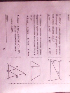 ОТВЕТ К 4 НОМЕРУ......обозначим малое основание- BC,,,,, большое-AD...высота опущена к точкам R и K.....следовательно если трапеция равнобедренная можно смело с обоих сторон опустить высоту....и отрезки AR=KD=6см ..значит RK=14-6=8см.....так как BC=RK...BC=8см