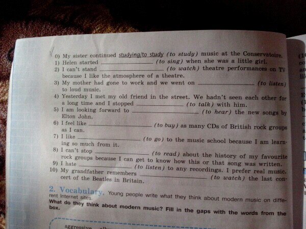 Какую музыку делать молодым людям? Завершите предложения, используя Винг формы или инфинитивами. Более, чем один вариант вщзможен