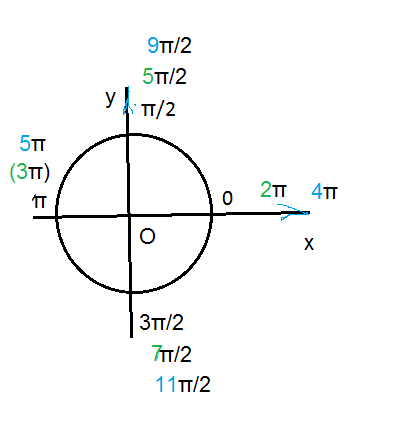 На третьем витке окружности расставлены точки 4π; 9π/2; 5π; 11π/2