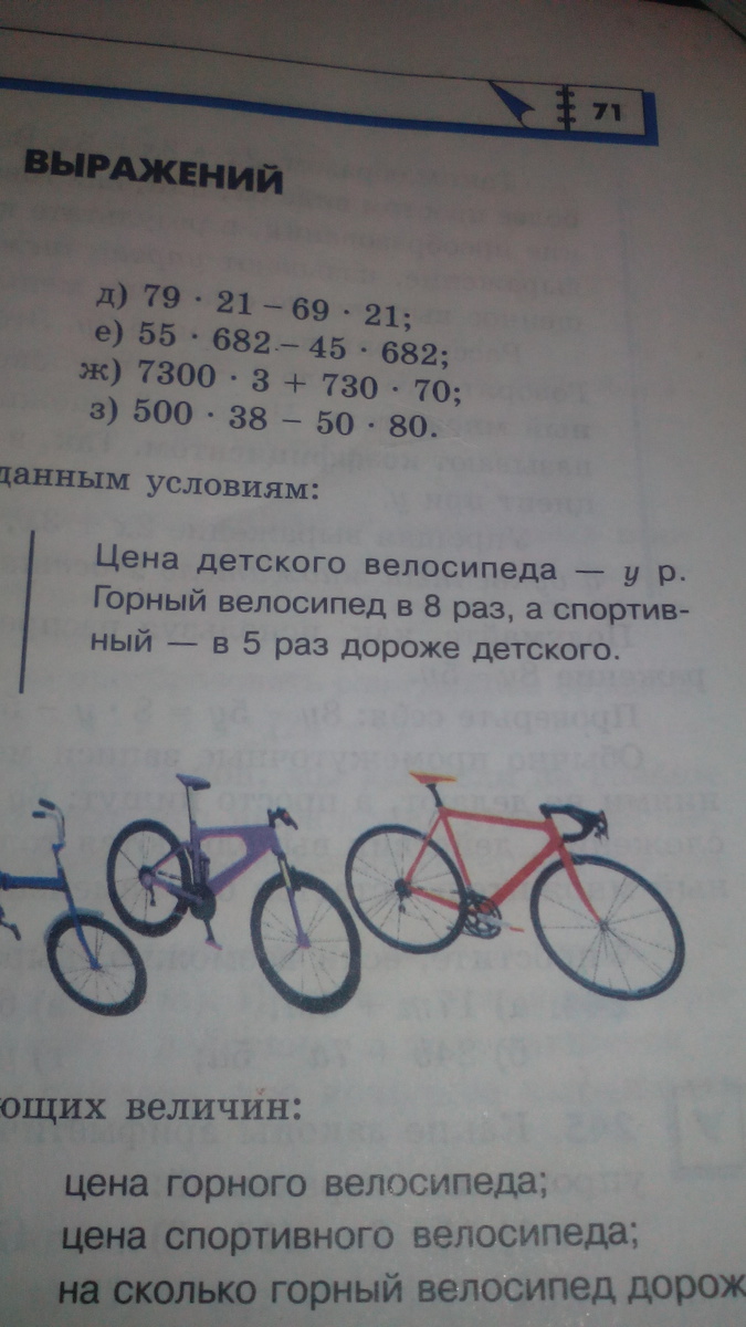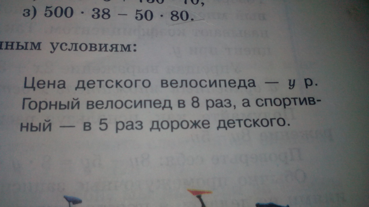 Цена детского велосипеда — y р. Горный велосипед в 8 раз, а спортивный — в 5 раз дороже детского.