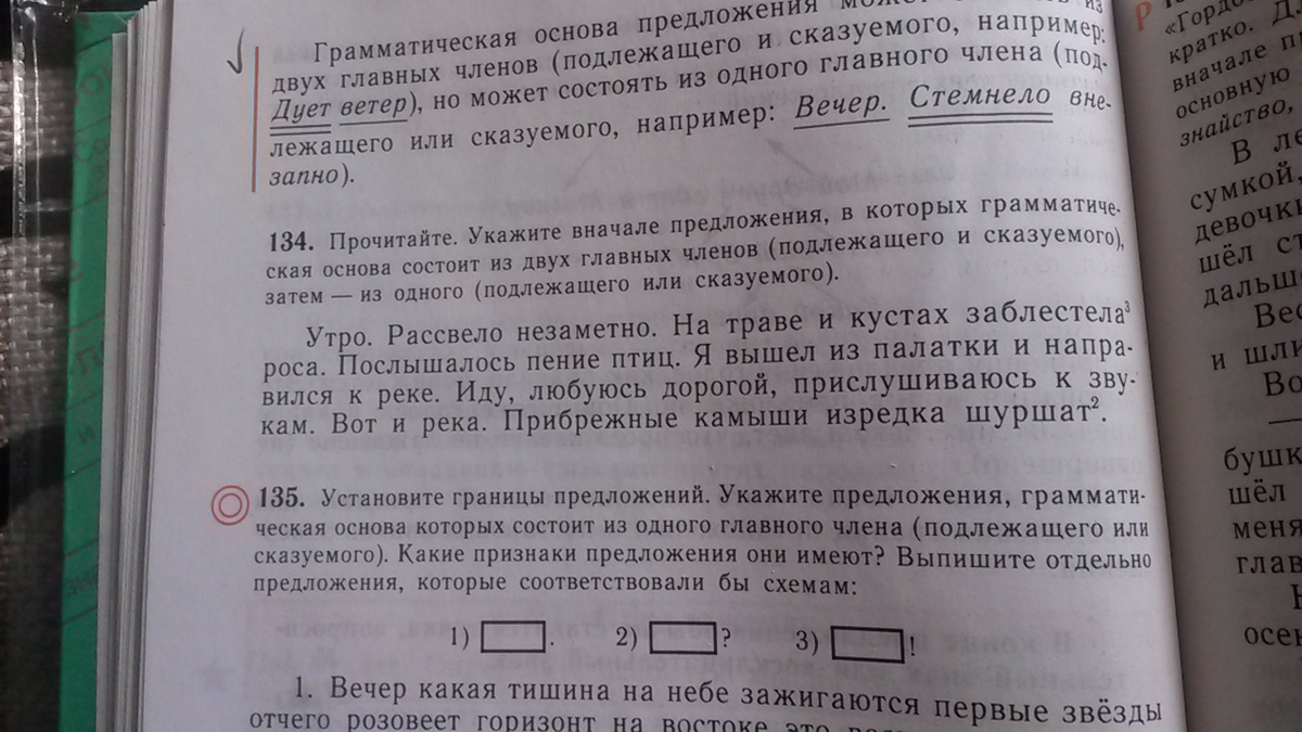 1. На траве и кустах заблестела роса. Послышалось пение птиц. Я вышел из палатки и направился к реке. Прибрежные камыши изредка шуршат.