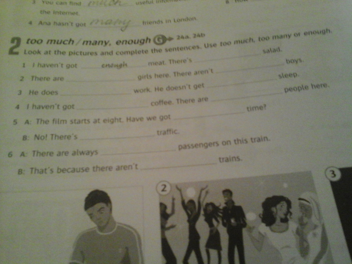 1. Too much 2. Too many, enough 3. Too much, enough 4. Enough, too many 5. Enough, too much 6. Too many, enough