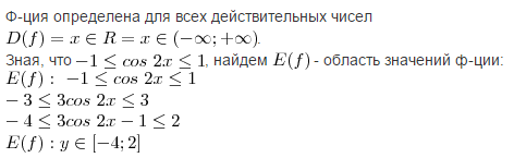 -4 leq 3cos 2x -1 leq 2 \ E(f): y in [-4;2]](https://tex.z-dn.net/?f=E%28f%29%3A++-1+leq+cos++2x+leq1+%5C+%0A-3+leq+3cos++2x+leq+3+%5C+%0A-4+leq+3cos++2x+-1+leq++2+%5C+E%28f%29%3A+y+in+%5B-4%3B2%5D)