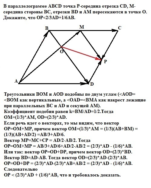 В параллелограмме ABCD точка P-середина отрезка CD, M- середина стороны BC, отрезки BD и AM пересекаются в точке O.Докажите, что OP<2/3AD+1/6AB
